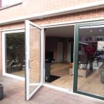 Verbouwing: voor en achterzijde. Merk: "Kömmerling". Holland profiel. Kleur wit en mosgroen met houtnerf. Glas HR++ 4/16Argon/4 U-waarde 1.1
