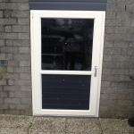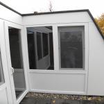 Verbouwing achterzijde en voordeur. Merk: "Kömmerling". 5 Kamer profiel, EuroFutur "Elegance". Openslaande deuren in zij ramen ventilatie rooster. Raam in badkamer ornamentglas "Chinchilla" Slaapkamer en douche raam. Nieuwe voordeur. Kleur binnen wit (RAL9010), buiten wit en blauw(R...